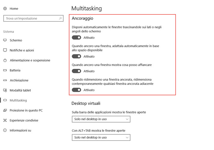 Su Ancoraggio occorre attivare la prima opzione per disporre automaticamente le finestre trascinandole sui lati o negli angoli dello schermo. Se si disattiva il primo cursore, verranno disattivati anche tutti gli altri. Le altre tre opzioni di ancoraggio per il multitasking sono:
