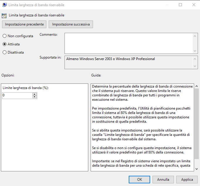 Nella nuova schermata selezioniamo innanzitutto l’opzione Attivata per visualizzare il limite corrente della banda riservabile. Per impostazione predefinita è settato a 80%. È possibile modificarlo a piacere. Ricordiamo, però, che se lo settiamo a 0% i processi di sistema non saranno prioritari e useranno la banda come tutti gli altri.