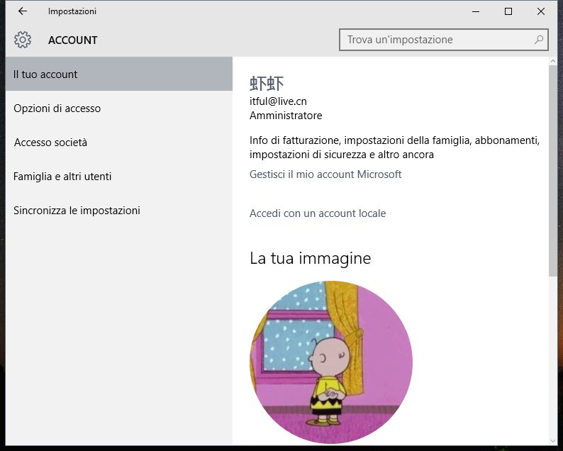 Da qui è possibile modificare la propria immagine o scegliere di effettuare l’accesso con un account locale