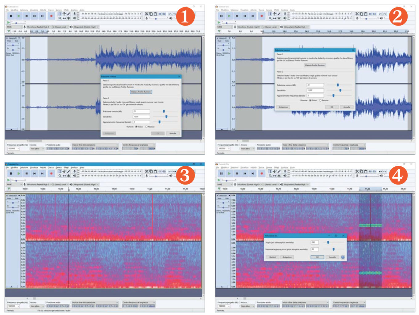 Di seguito vediamo le operazioni da compiere per eliminare questi due tipi di difetti, uti- lizzando rispettivamente Audacity e Audio & Music Lab Premium.