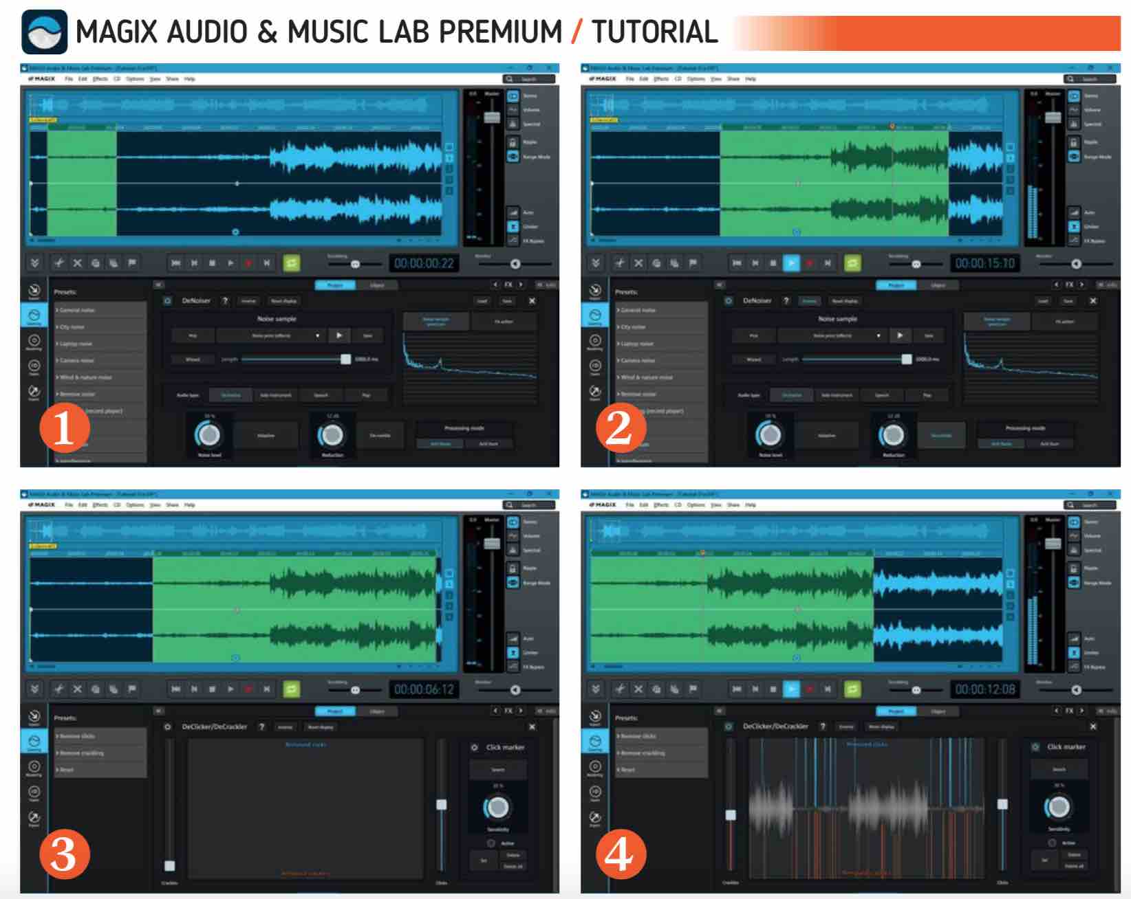 Le cose peggiorano nettamente quando il disco in vinile è vecchio e usurato, magari per essere stato ascoltato innumerevoli volte su giradischi con testine di bassa qualità dalle imperfette capacità di tracciamento: il fruscio ha un volume più elevato a causa del deterioramento delle pareti dei solchi, inoltre i clic e i toc, dovuti sia a graffi e segni sia alle impurità depositate e accumulate nel tempo, non si contano. Per ripulire la musica e liberarla da questi fastidiosi rumori di fondo ci vengono in aiuto programmi come Audacity e Magix Audio & Music Lab Premium, dotati di potenti strumenti che discriminano i difetti dalla musica ed eliminano i primi senza modificare (o quasi) la seconda. I difetti sono sostanzialmente di due tipi: quelli continui e quelli impulsivi. I primi sono il fruscio, dovuto allo sfregamento della puntina sulla superficie del disco, e il ronzio della corrente alternata in un impianto mal schermato, mentre i secondi sono i clic e i toc, che possono diventare un crepitio pressoché continuo con i dischi molto vecchi e sporchi.