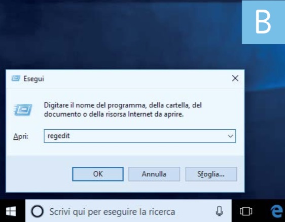 Qui il sistema operativo vorrebbe raccogliere i progetti che coinvolgono le funzioni 3D del sistema operativo, come gli oggetti e gli scenari realizzati con Paint 3D o i modelli pronti per la stampa tridimensionale. Ma la maggior parte degli utenti di Windows non usa ancora queste funzioni e non ha bisogno di questa cartella. Scopriamo quindi come nasconderla: il percorso sarà comunque accessibile (per default si trova nella cartella dell’utente), ma non verrà mostrato nella pagina Questo PC di Esplora file. Aprite il Registro di sistema di Windows, per esempio richiamando la finestra di esecuzione con la scorciatoia da tastiera Windows+R e digitando regedit nella casella di ricerca (figura B).