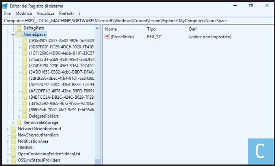 Raggiungete la chiave HKEY_LOCAL_MACHINE\SOFTWARE\ Microsoft\Windows\CurrentVersion\Explorer\ MyComputer\NameSpace (figura C)